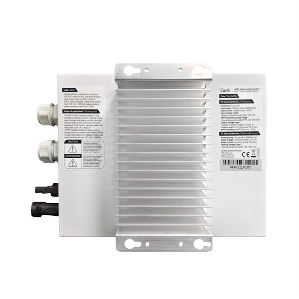 Invertor GETI GWH01 4000W MPPT vyvinutý pro FV ohřev vody umožňuje přímé použití systémů fotovoltaických panelů pro napájení odporových topných zařízení, jako jsou elektrokotle, topidla, topné rohože, ohřev vody atd. Invertor je navíc vybaven i AC vstupem, který umožňuje připojení invertoru k síťovému napětí a ohřev vody i v době, kdy je sluneční záření pro ohřev nedostačující.