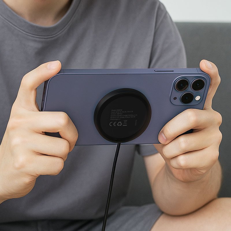 - Magnetické přichycení – zajišťuje přesné zarovnání cívky a stabilní nabíjení bez přerušení.