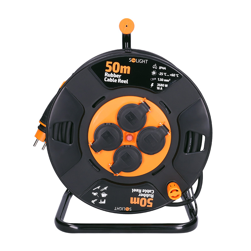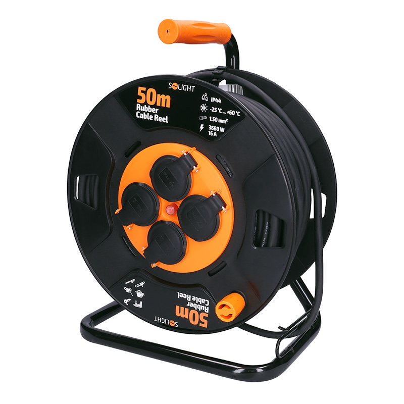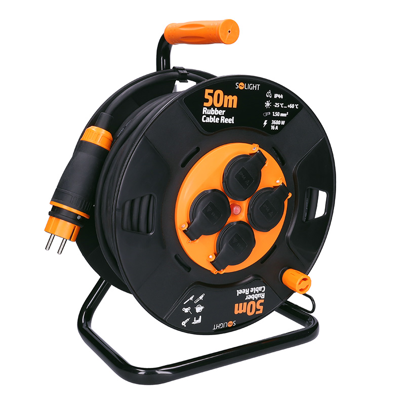 Solight PB34 prodlužovací přívod na bubnu, 4 zásuvky, venkovní, 50m gumový kabel, 3x 1,5mm2, IP44