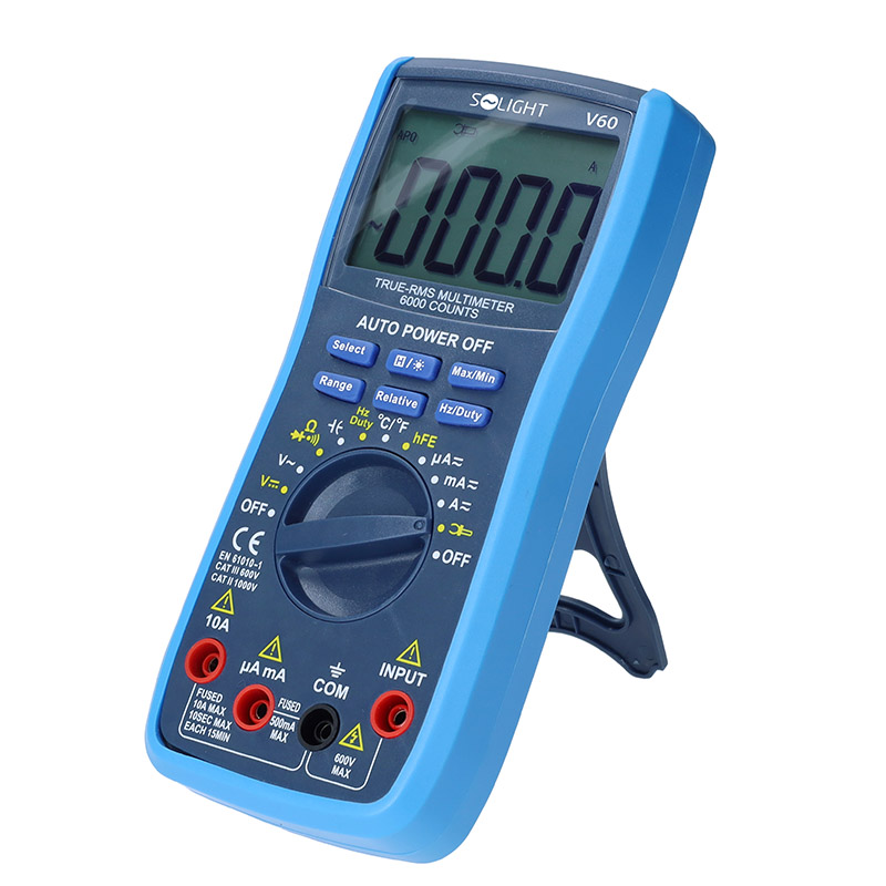Profesionální multimetr Digitální multimetr s podsvíceným LCD displejem (64 × 42 mm) a maximálním zobrazením 6000 hodnot. Nabízí funkci HOLD pro zachování hodnoty, relativní měření (REL Mode) a funkci MAX/MIN pro záznam extrémních hodnot. Test diod, tranVíce
