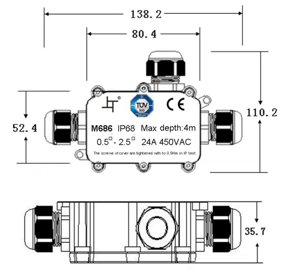 Vodotěsná propojovací krabička sloužící k propojení dvou a třížilových vodičů. Technické parametry: - počet kontaktů: 4; - počet vstupů: 1; - počet výstupů: 2; - maximální napětí: 450V AC; - maximální proud: 24A; - voděodolnost: IP68; - pro průměrVíce