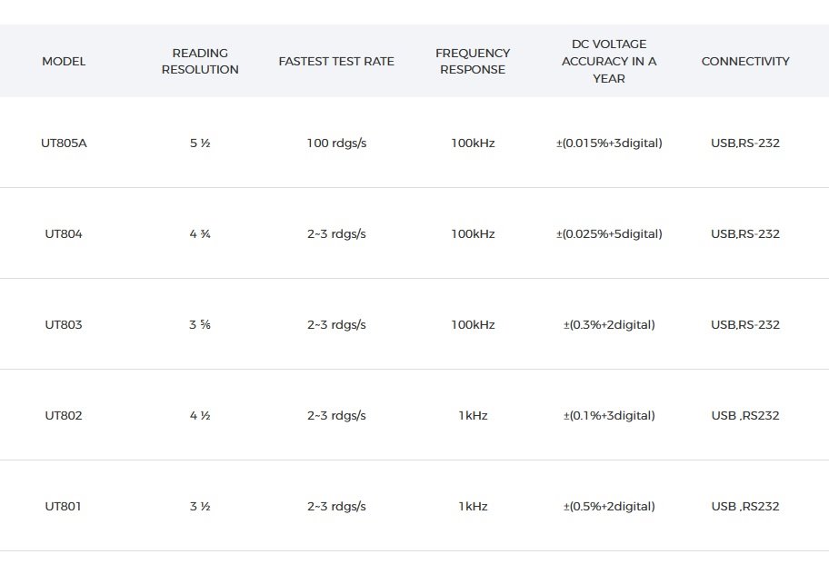 Digitální stolní multimetr UNI-T UT804 • s připojením k PC (RS232C a USB) • s automatickým nastavováním rozsahů • špičkový displej s analogovým bargrafem • v horní části přístroje praktický uzaviratelný prostor na kabely TECHNICKÉ SPECIFIKACE: Více