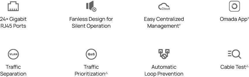 Centrální správa prostřednictvím cloudu Omada přes webové rozhraní nebo mobilní aplikaci umožňuje pohodlné monitorování a konfiguraci odkudkoli. Switch je vybaven funkcemi automatické prevence smyček a IGMP Snooping, což zlepšuje efektivitu síťového provozu a zabraňuje výpadkům. Velká MAC tabulka s kapacitou 8K adres a podpora rámců až 15 kB zajišťují kompatibilitu i s rozsáhlými síťovými strukturami.