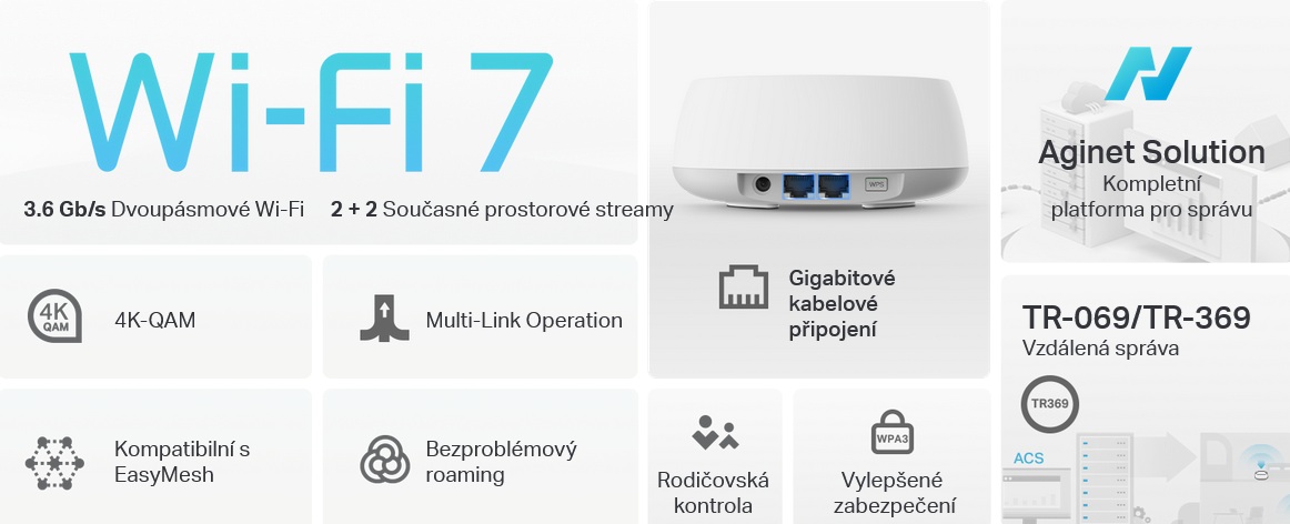 - Vzdálená správa: TAUC (TP-Link Aginet Unified Cloud, TR-369) včetně TR-069, TR-098, TR-181, TR-111 a TR-143 protokolů.