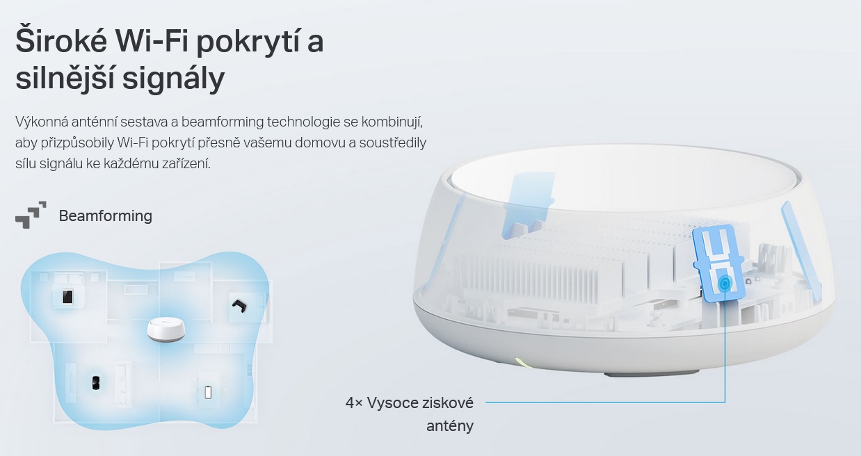 - Lepší pokrytí: Výkonné antény a beamforming technologie zajišťují silnou a spolehlivou Wi-Fi v celém domě.