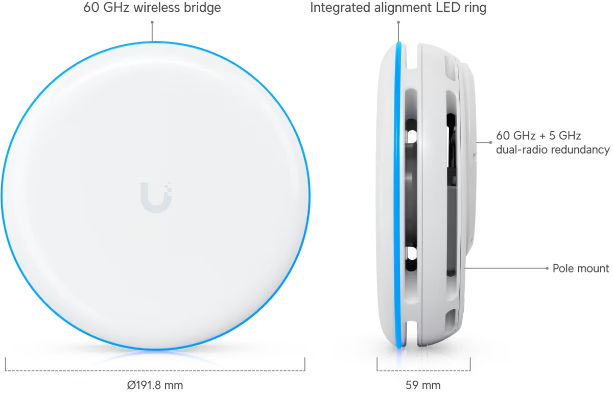Ubiquiti UniFi Building Bridge je 60GHz PtP pojítko s 5GHz zálohou pro rozšíření sítě například o sousední budovu. Jednotka je vybavena (1) 1Gbit PoE-In portem, dosahuje propustnosti až 1,7Gbps a maximálního dosahu až 500m. Pro zaměřování má po bocích intVíce