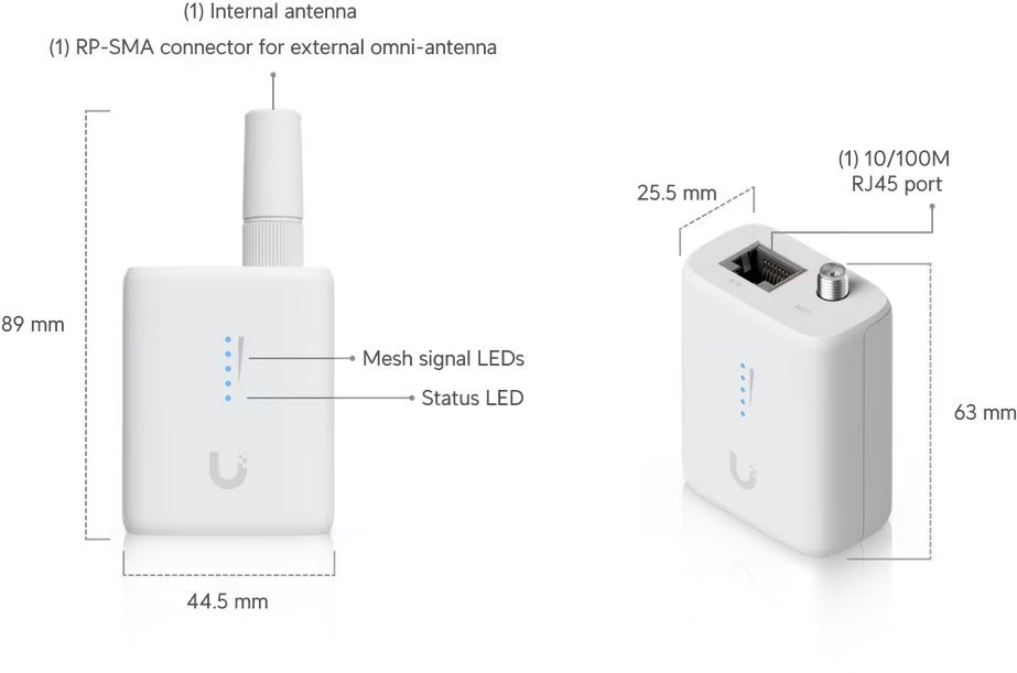 - (1) 10/100Mbps port a (1) RP-SMA female konektor pro externí anténu